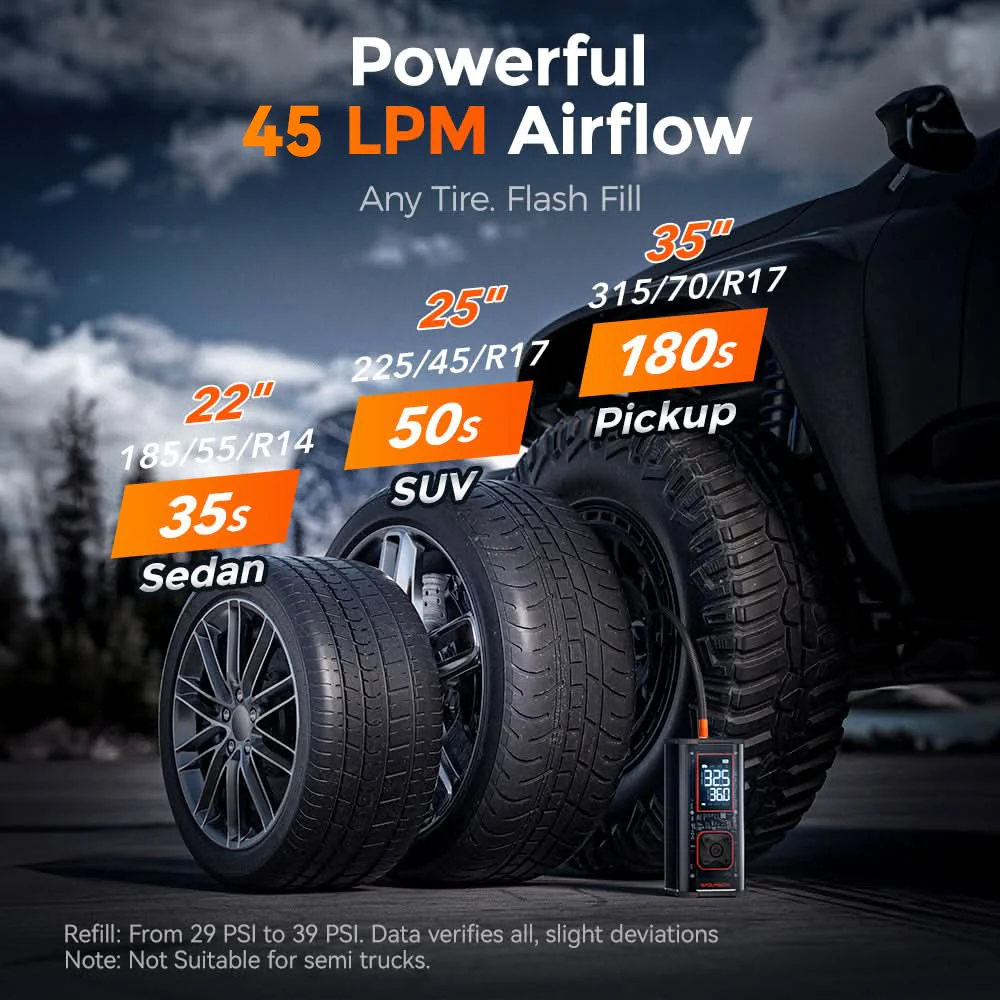 اگر با SUV، RV یا آفرود سنگین سروکار داری، این پمپ معمولی نیست. با دبی هوای 45 لیتر در دقیقه (45LPM)، حتی لاستیکهای 37 اینچی رو هم بدون مکث باد میکنه. از 80٪ تا 100٪ فقط در حدود 3 دقیقه.