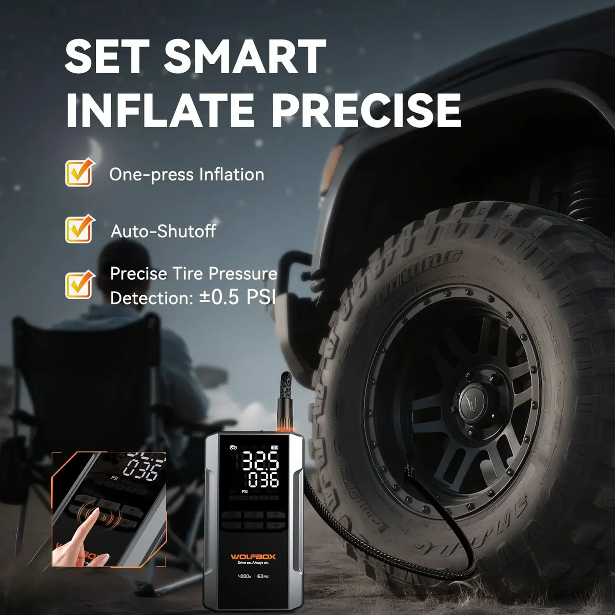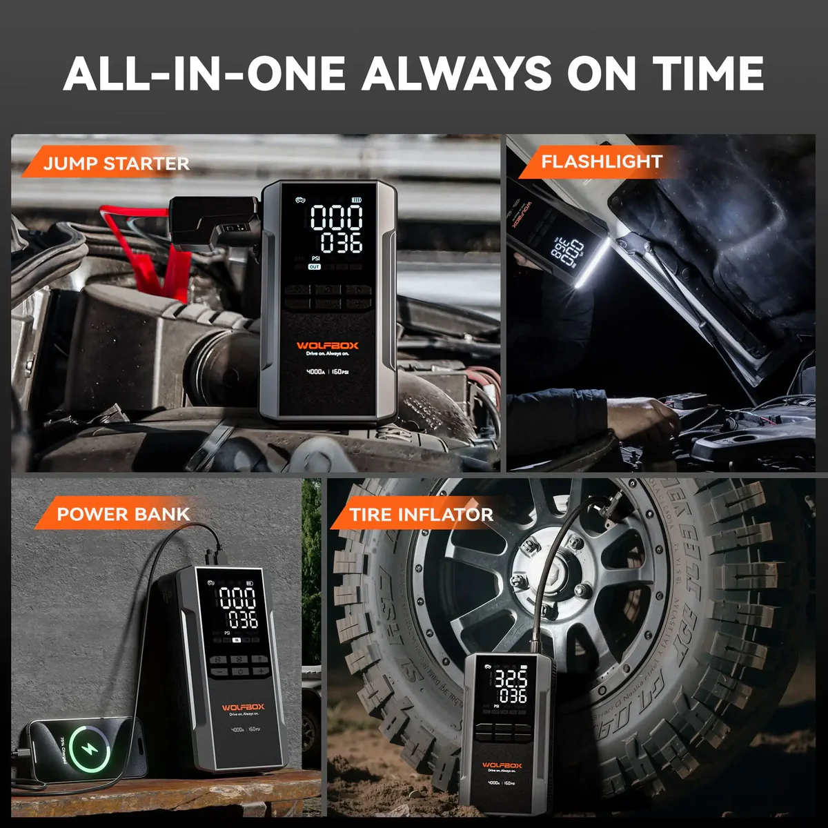 WOLFBOX 4-in-1 Jump Starter with Air Compressor ترکیبی هوشمند از جامپاستارتر قدرتمند، کمپرسور باد سریع، پاوربانک پرقدرت و چراغ اضطراری است؛ همه در یک دستگاه جمعوجور و قابل حمل. طراحی شده برای زمانی که واقعاً بهش نیاز داری، نه وقتی اوضاع خوب است.
