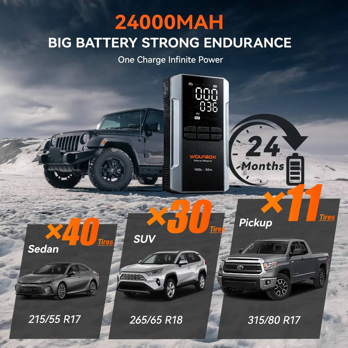 با باتری 24,000mAh و جریان پیک 4000A، قادر به استارتزدن خودروهای 12 ولت با موتور بنزینی و دیزلی تا حجم 10 لیتر است. مناسب سدان، SUV، وانت، موتورسیکلت و حتی ماشینآلات کوچک. با یک شارژ کامل تا 40 بار استارت میزند.